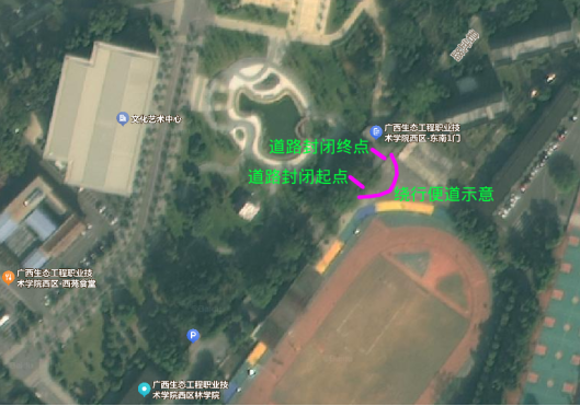 管制期间,社会车辆请按照现场引导标志牌和现场安全管理人员的疏导,绕行广西生态工程职业技术学院东校区内部临时道路,请过往车辆减速慢行,注意通行安全。